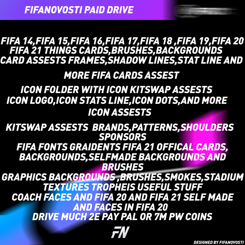 if you decide to buy a drive you get fifa 14 to fifa 21 folders with wallpapers and brushes and psd / png / jpg cards of course there are folders for graphic edite you can also use my templates and of course we have icon stuff I want to thank everyone for shopping